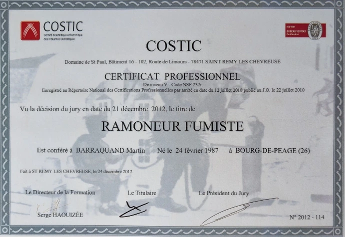j'ai suivi une formation au COSTIC (Comité Scientifique et Technique des industries Climatiques) et obtenu une certification de Ramoneur-Fumiste (qualification obligatoire pour effectuer ce métier) en 2012.